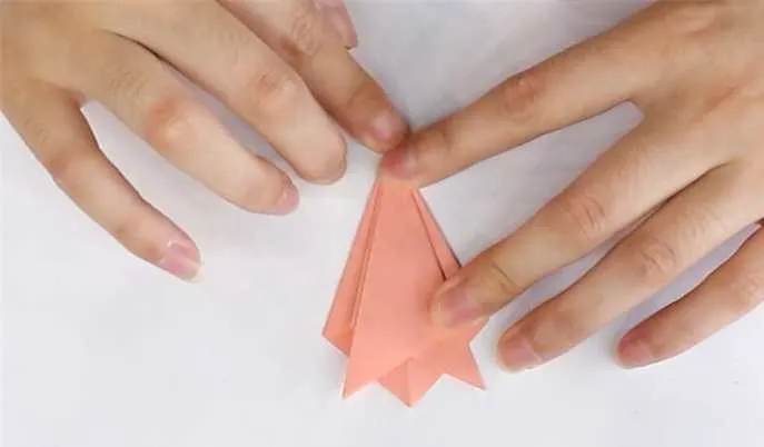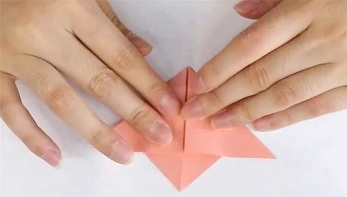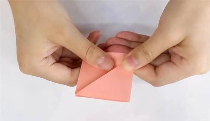 (2)翻过面来,向中线两侧的对角向上翻折,形成一个三角形