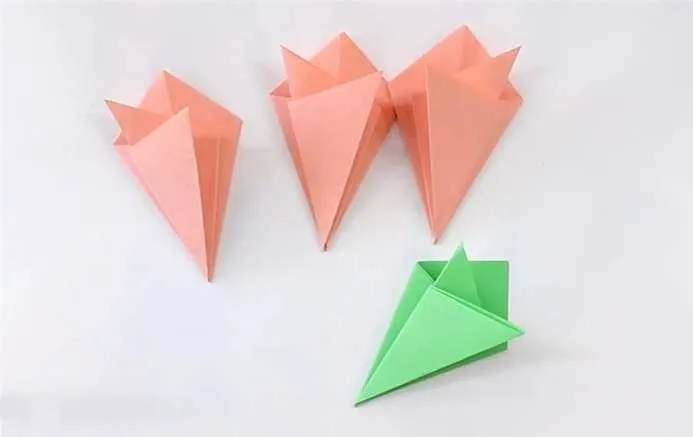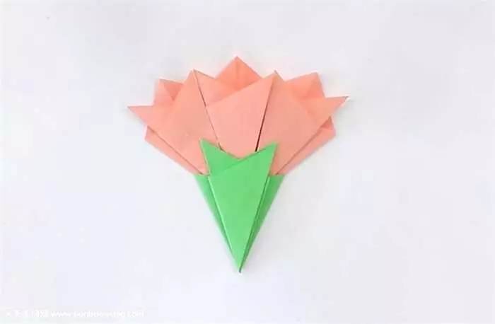 (5)最后用固体胶将粉色部分依着底角一起粘连起来后,绿色部分则粘连在下方充当花托,一朵康乃馨就折好啦
