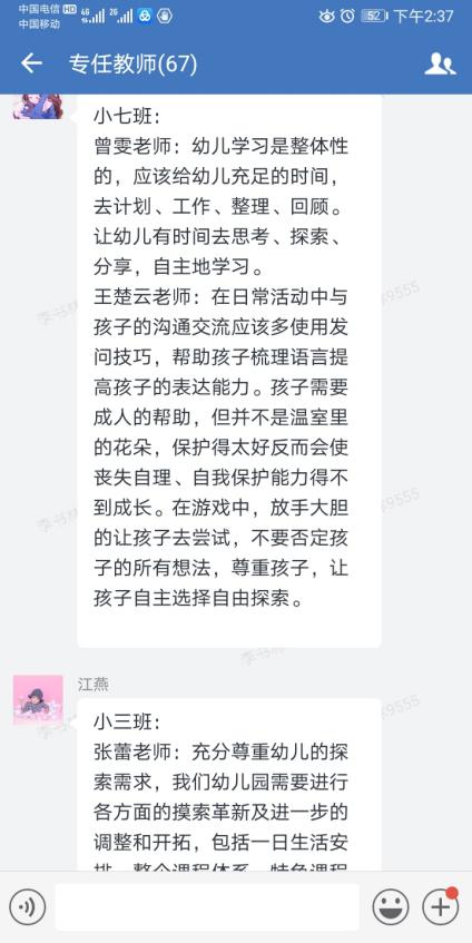廖老师利用理论与案例结合的方式,展开了对幼儿主动学习、自由游戏等方面展开谈论。她提出幼儿的学习应该是在玩和探索中主动学习的,里面伴随着创造性和批判性的思考,因此我们的教育需要尊重幼儿的学习方式,减少学习过程的控制;观察倾听,顺应需求,拓展孩子的想法,提供进一步探索的可能;鼓励和欣赏孩子,并给予孩子,表现与表达自我的机会。