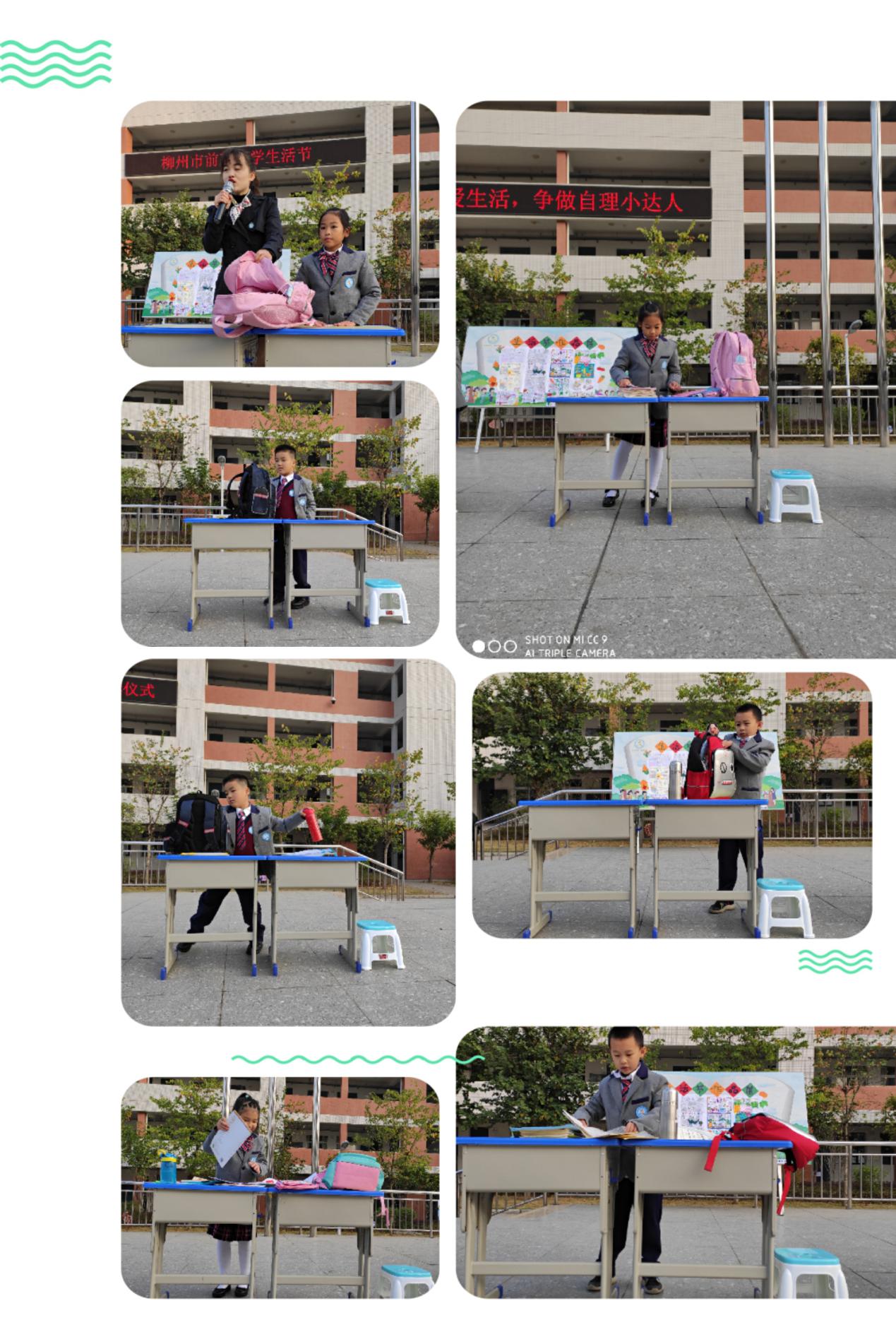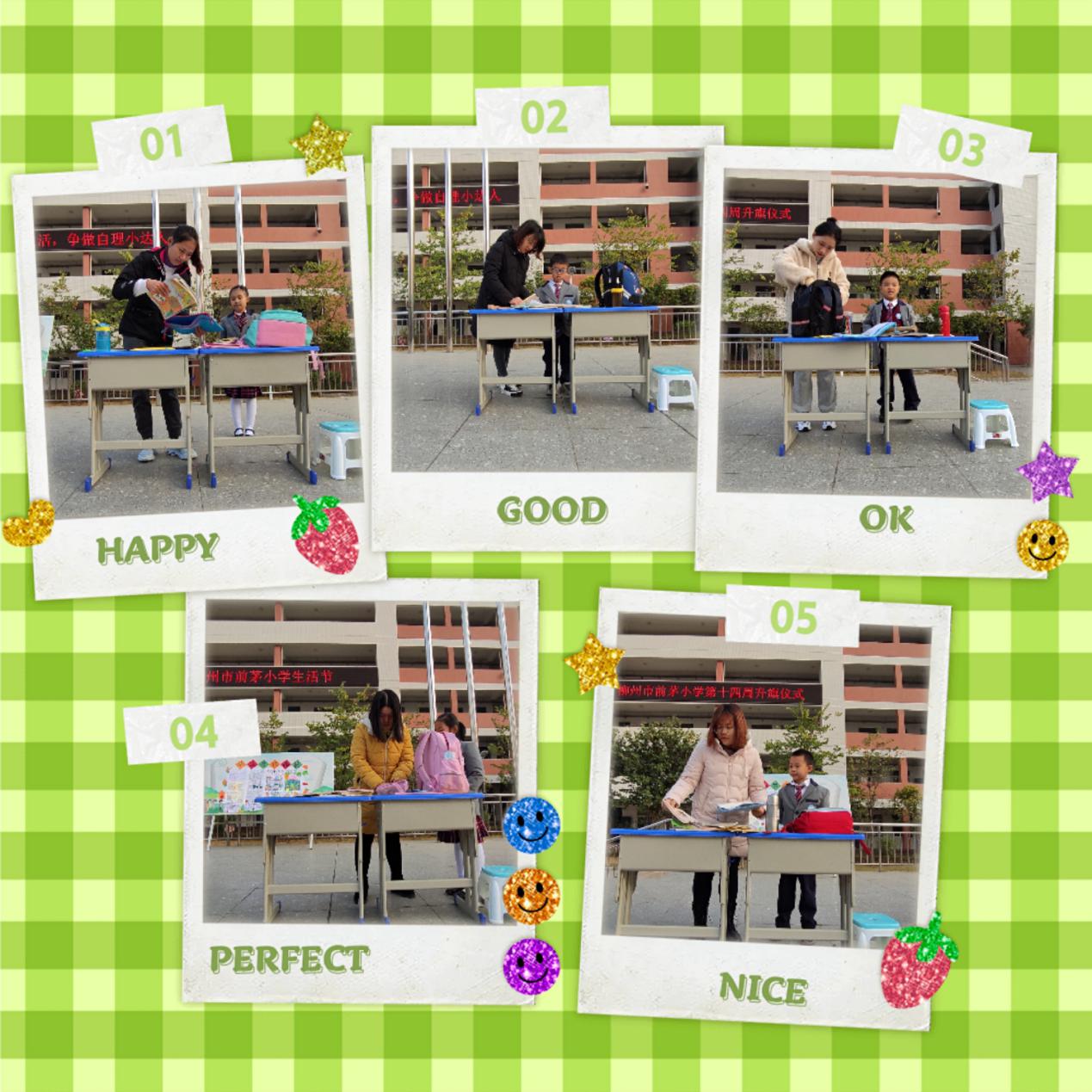 瞧,一年级的孩子们激动的心情溢于言表!他们展示的是整理书包,比比谁能在最短的时间内把文具、书本整整齐齐地放回到书包里面。