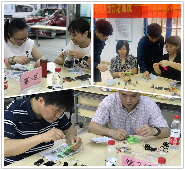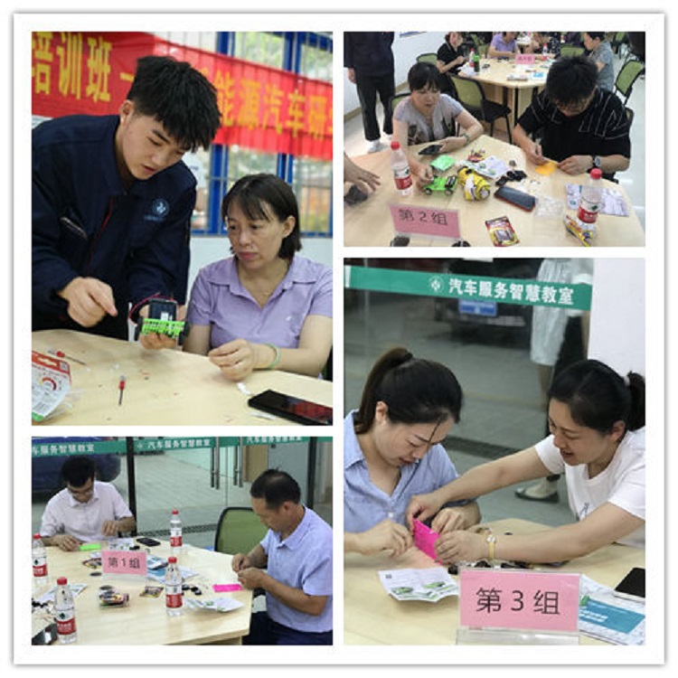 在实训车间,在朱柄耀老师的指导下,学员利用材料包进行新能源小车的拼装。学员们的积极性非常高,跃跃欲试,拼好的小车迫不及待地拿到赛道上进行测试,试试小车会不会走,能不能走直线。