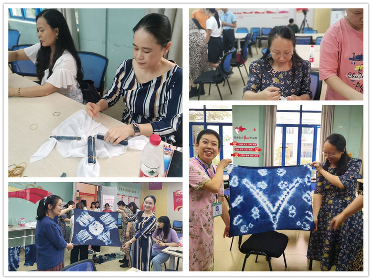 学员们积极体验扎染技艺,用捆扎、折叠、卷扎、夹扎等方式,制成自己喜欢的图案。