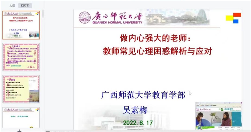 8月17日下午,广西师范大学教育学部心理学教授吴素梅教授,开展了《做内心强大的教师——教师常见心理困惑解析》专题讲座,吴素梅教授是广西师范大学教育学部心理学教授、硕士生导师,广西师范大学大学生心理健康教育中心副主任,广西戒毒矫治学会第一届理事,广西心理学会第九届常务理事,曾留学俄罗斯喀山师范大学。长期从事心理咨询和心理健康教育的教学、研究和临床工作。主持和参加省部以上科研课题12项、著作和教材12部,发表论文50多篇,多项研究成果和论文获奖。曾被评为全国普及应用心理科学教育先进工作者、全国大学生心理健康教育先进工作者,广西高校大学生心理健康教育先进个人、全国教育硕士优秀教师等。作为教书育人的“灵魂工程师”,教师的心理健康关乎每一个学生的健康成长和每一个家庭的幸福生活。学会在日常工作和生活中管理好自己的压力、调适好自身的心理状态,既可以帮助老师们更好地认识自我、调节情绪、完善人格、激发潜能、收获心理健康;也可以让每一个教师更快乐地工作、更幸福地生活,并把这种幸福通过我们传递给每一个学生。本次讲座分第一部分教师心理困惑剖析:1.教师职业面临的几大心理矛盾,2.教师职业压力,3.新教师常见心理困惑;第二部分教师心理保健方法策略:1.适度宣泄,保持健康的情绪状态,2.合理认知,改变消极思维,3.认识自我,修养人格,4.有效沟通,建立良好的人际关系,5.采用积极的应对方式.