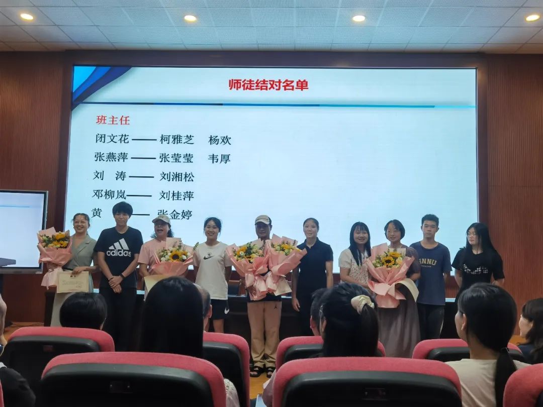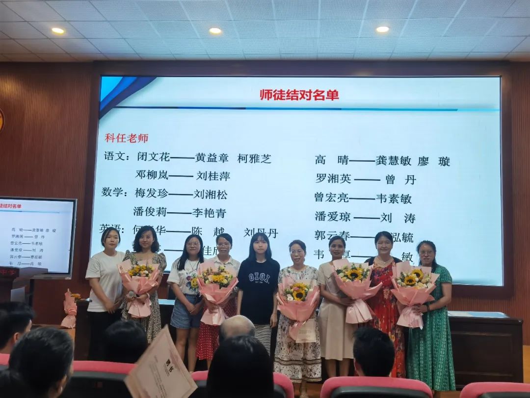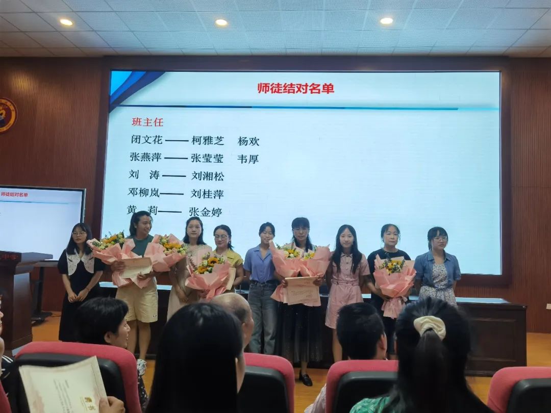 随后,由王莎老师公布师徒结对名单,各位校领导给师傅们颁发荣誉聘书,徒弟们也带着深深谢意为师傅们献上一束束鲜花。