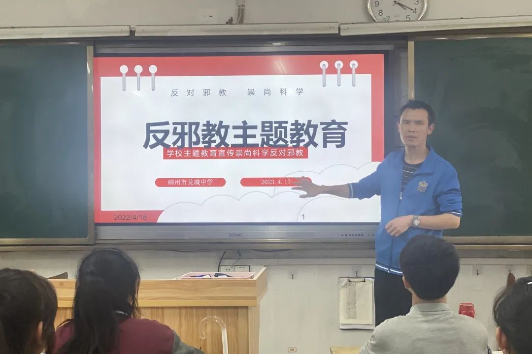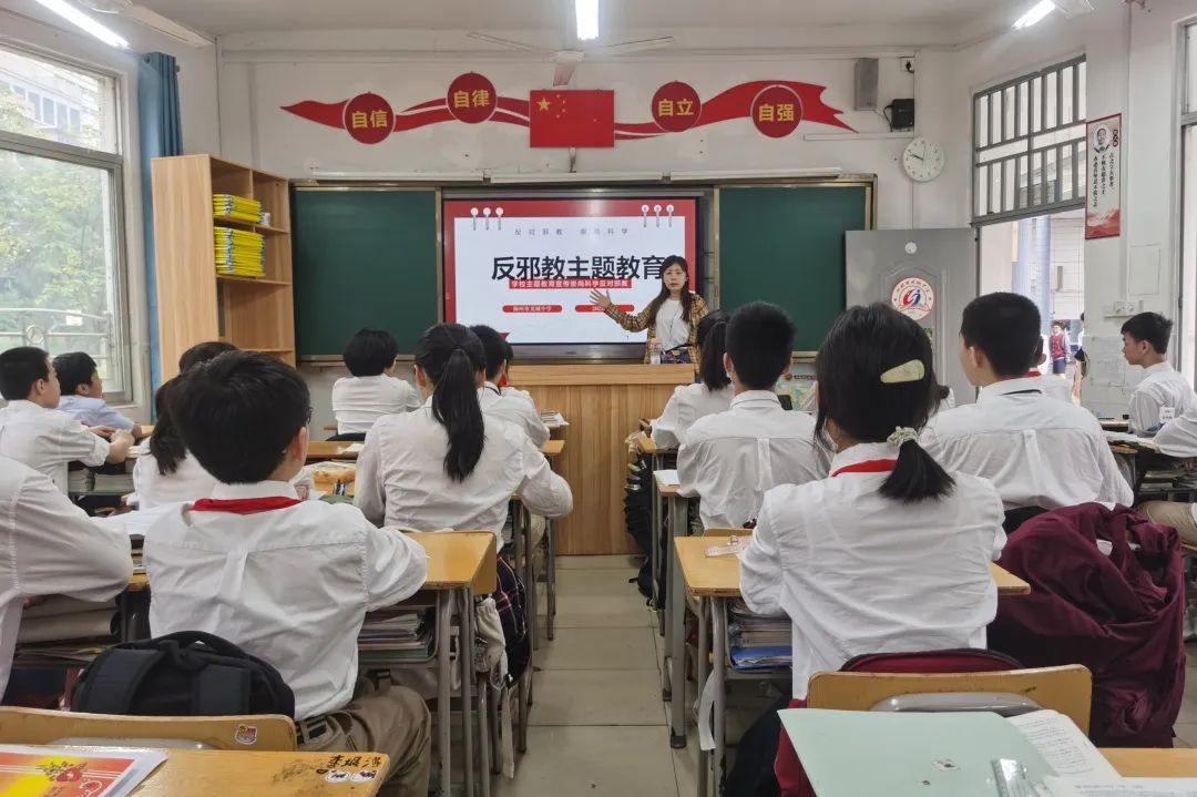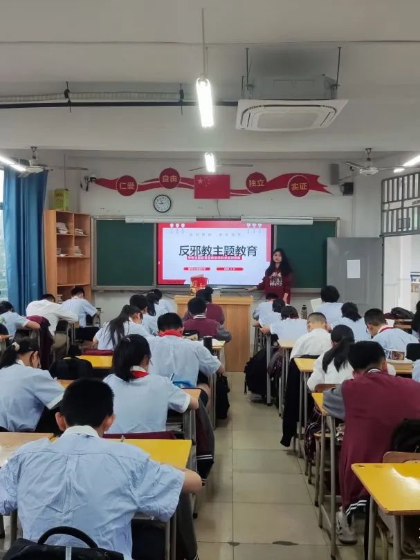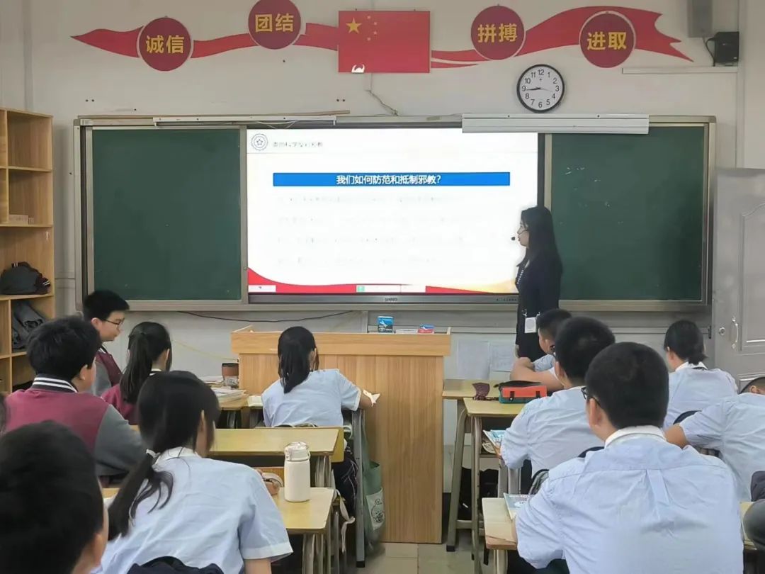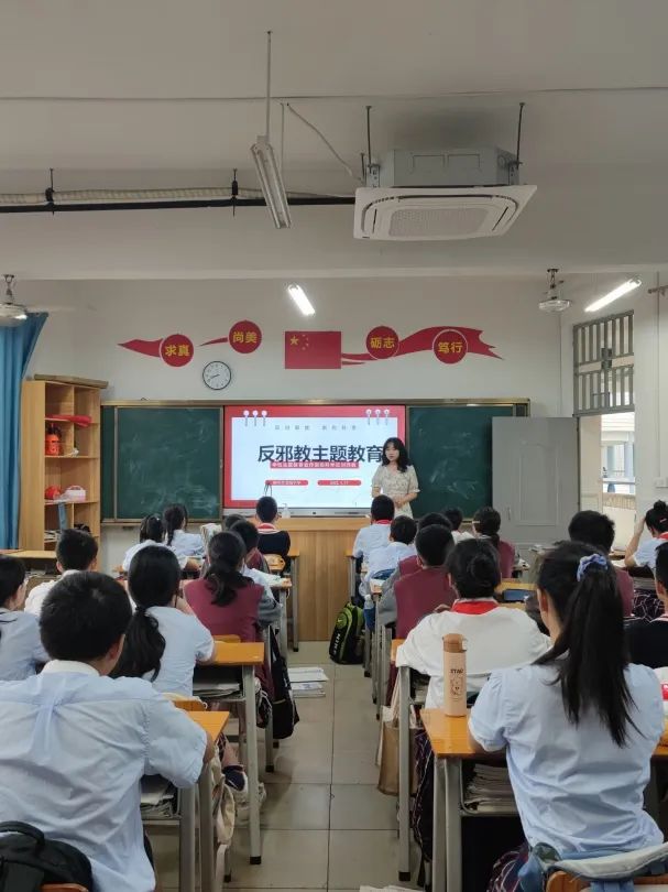 学校利用电子屏、国旗下讲话,在校园内外内营造起“崇尚科学,反对邪教”的浓厚氛围,倡导每位学生养成科学健康的生活方式,增强识别邪教、自觉抵制邪教的能力。