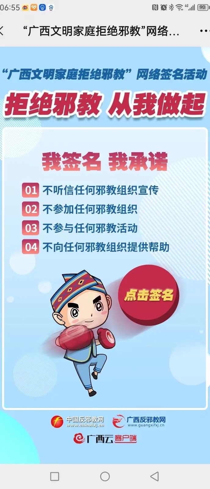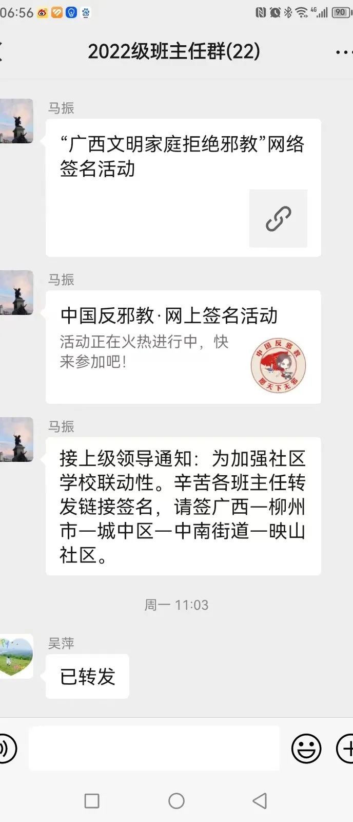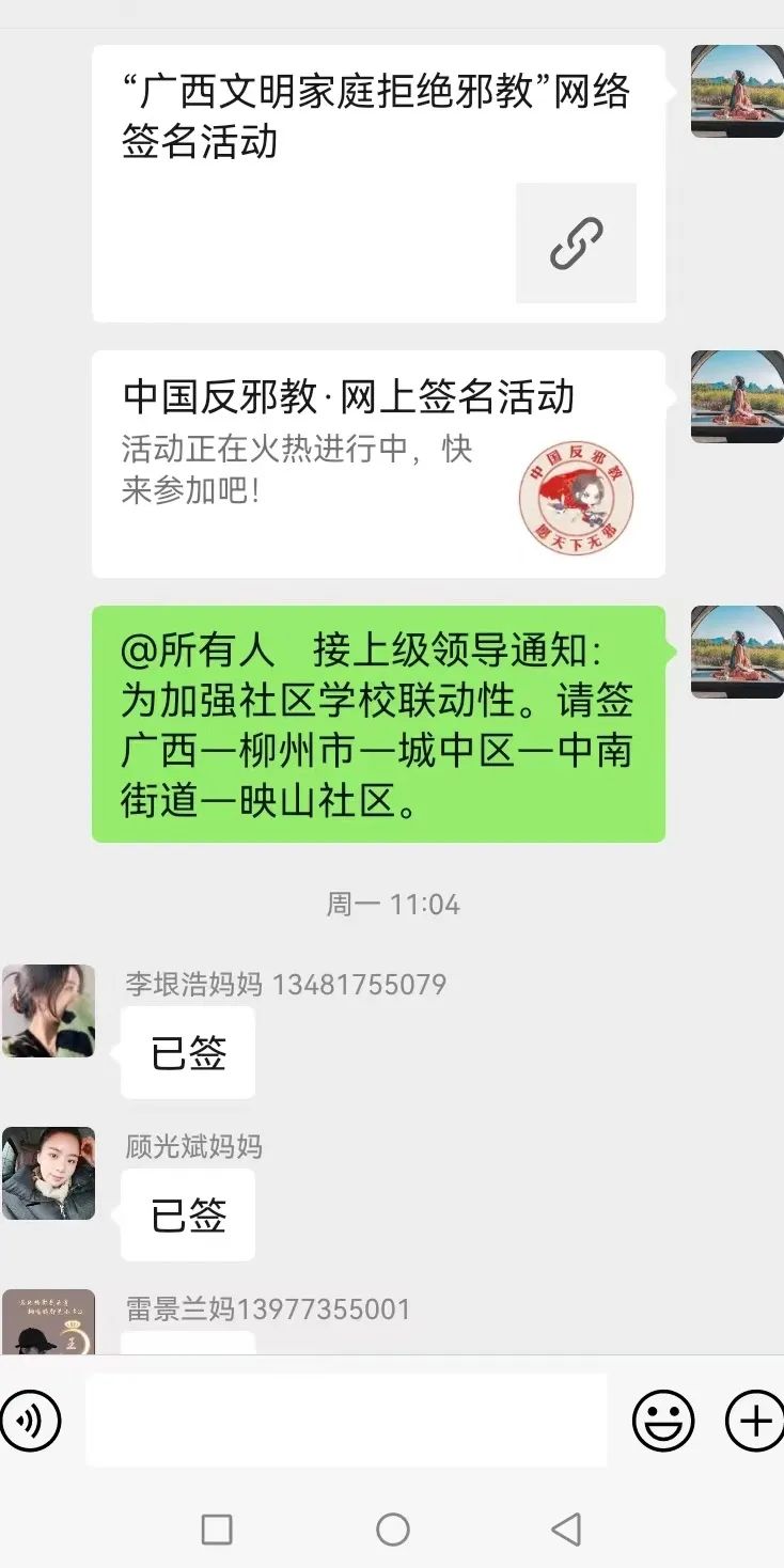 在家长中开展了“小手拉大手”反邪教知识宣传活动,进行“广西文明家庭拒绝邪教”网络签名活动,筑牢“家校反邪教”防线,形成家校合力,引导孩子树立正确的人生观和价值观,积极宣传邪教危害,弘扬科学精神。