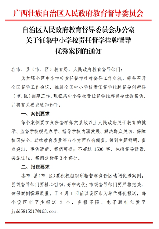 自治区人民政府教育督导委员会办公室关于征集中小学校责任督学挂牌督导优秀案例的通知(督导办)