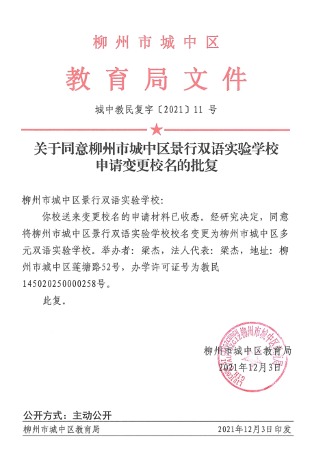 城中教民复字〔2021〕11号关于同意柳州市城中区景行双语实验学校申请变更校名的批复