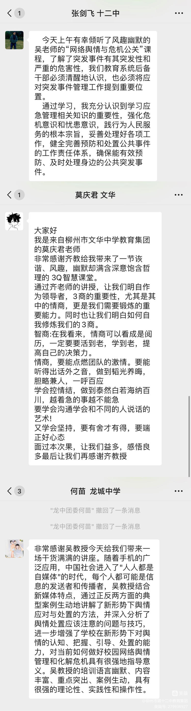 吴教授从网络舆情的概念及特点;教育网络舆情的内涵及发展趋势;教育网络舆情应对的内涵及意义;加强网络危机应对维护组织形象等四个方面,全面系统,深入浅出的为我们讲解网络舆情的重要性及应对策略。