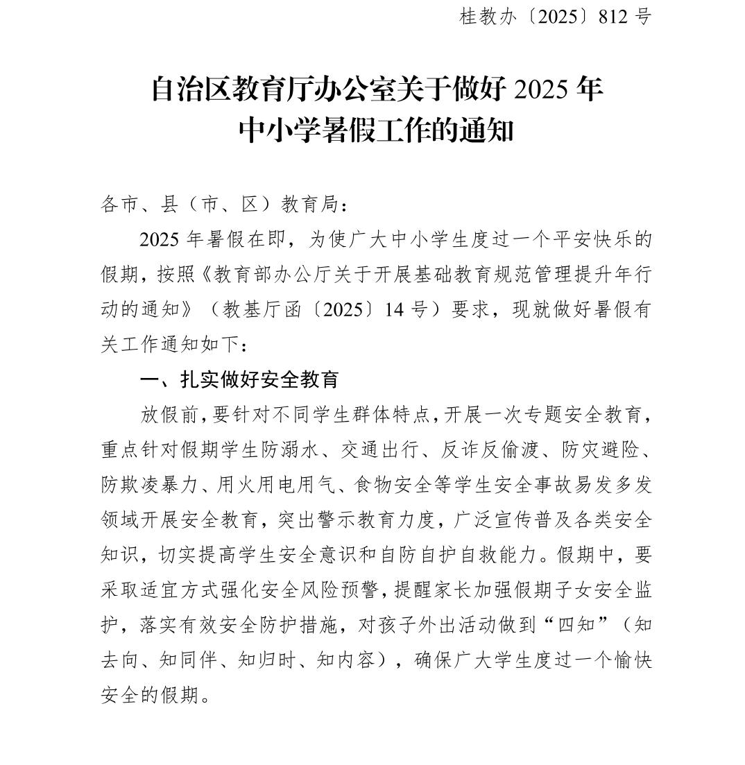 桂教办〔2025〕812号自治区教育厅办公室关于做好2025年中小学暑假工作的通知