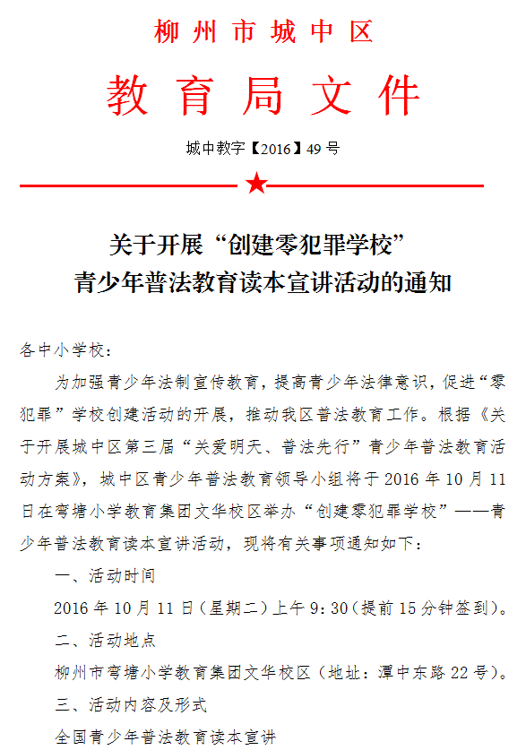 城中教字【2016】49号关于开展“创建零犯罪学校”青少年普法教育读本宣讲活动的通知