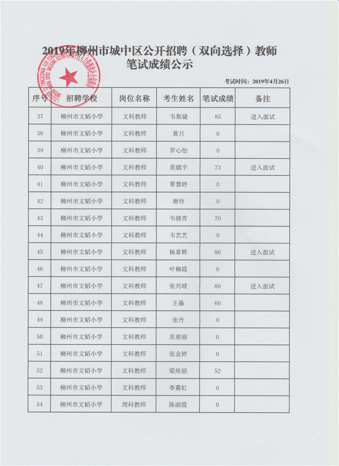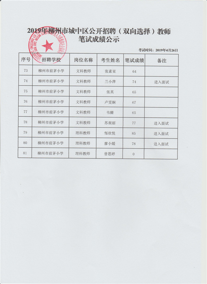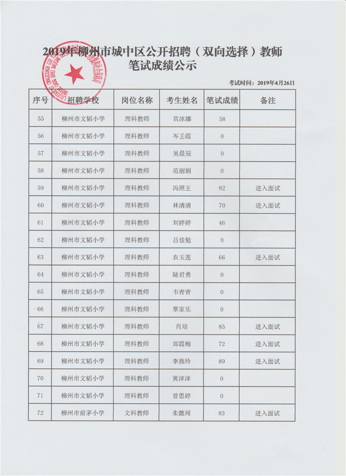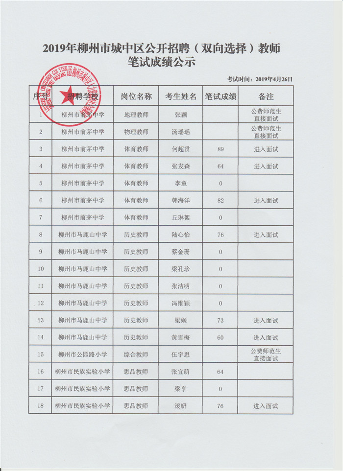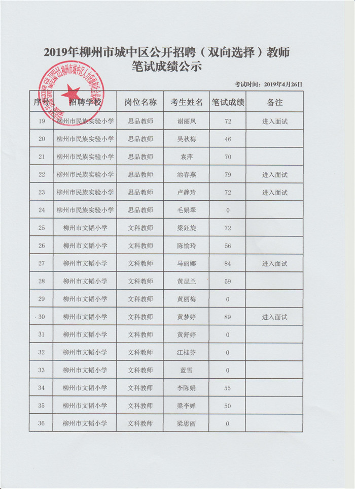 2019年柳州市城中区公开招聘(双向选择)教师笔试成绩公示