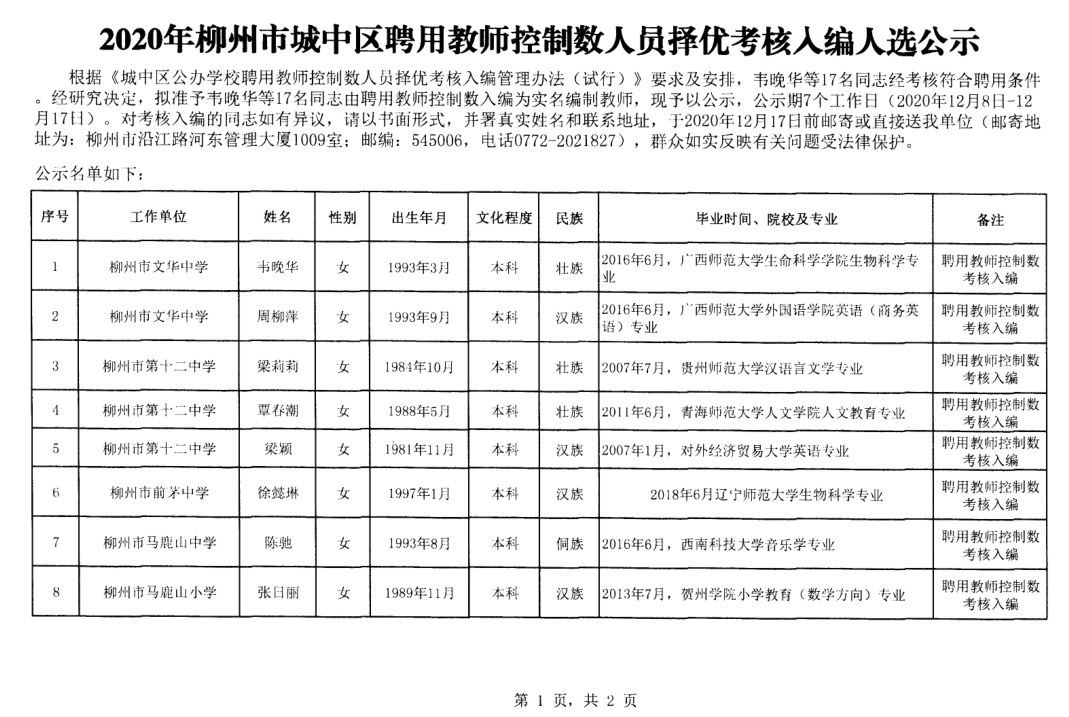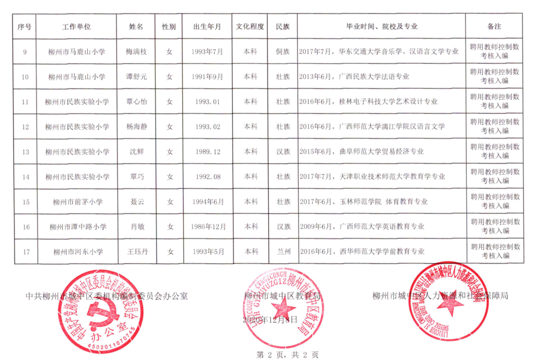 2020年柳州市城中区聘用教师控制数人员择优考核入编人选公示