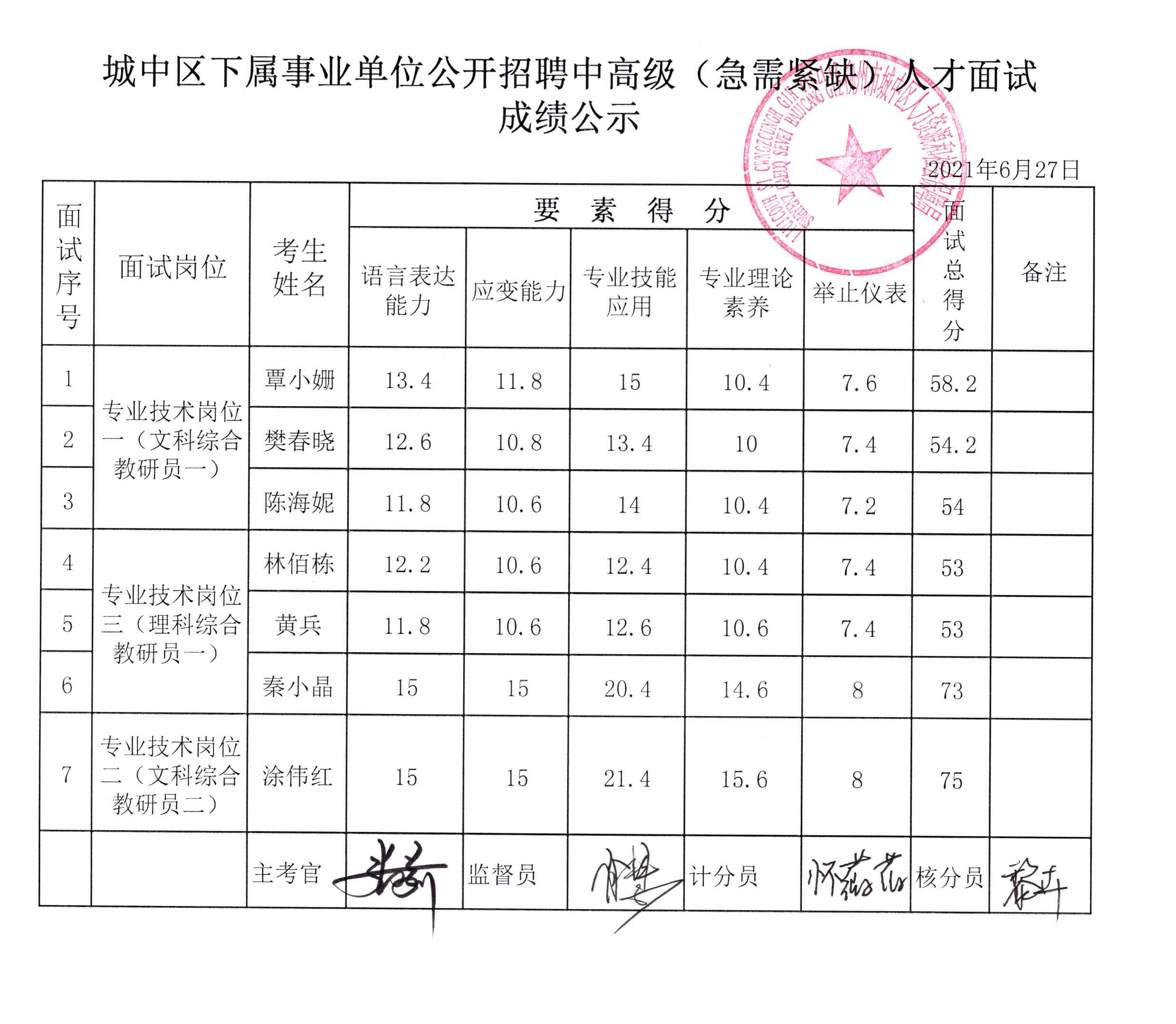 城中区下属事业单位公开招聘中高级(急需紧缺)人才面试成绩公示