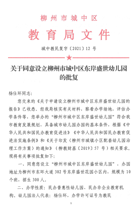 城中教民复字〔2021〕12号关于同意设立柳州市城中区东岸盛世幼儿园的批复