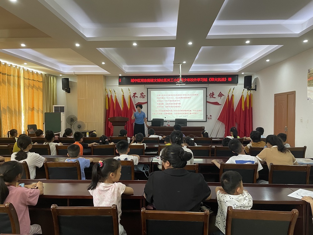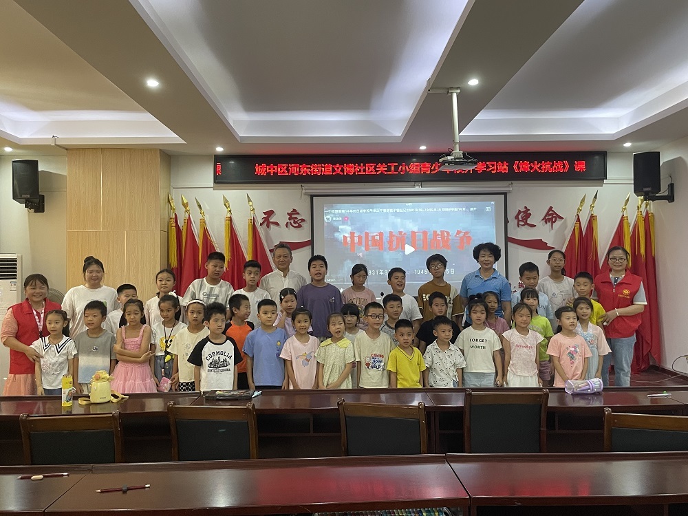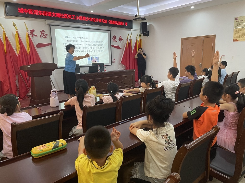 (城中区河东街道讯 信息员卢丽君报道、摄影)2025 年 7 月 3 日上午,在河东街道文博社区新时代文明实践站,一场别开生面的党史故事活动热烈开展。河东街道文博社区关工委以“烽火抗战”为主题,为辖区内的青少年们精心打造了一堂意义非凡的课。