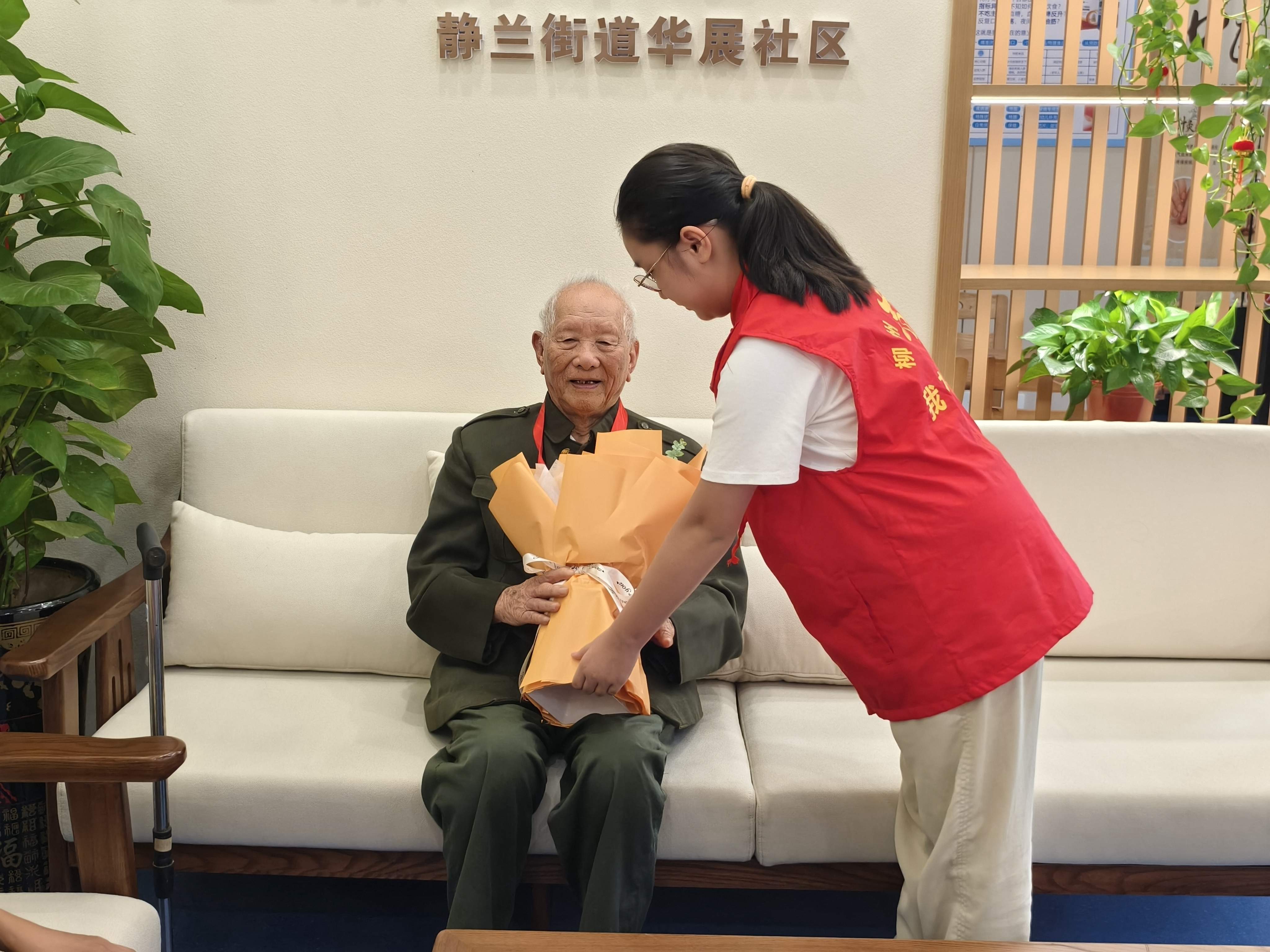 “爷爷,这束鲜花送给您!”8月12日下午,华展社区为老服务中心内暖意融融,辖区青少年在社区工作人员带领下,手捧鲜花看望慰问99岁高龄的老党员、老战士陈福,以社区党建品牌“微光聚暖•华展红帆”中的“微讲堂”形式,聆听那段烽火连天的革命岁月,接受红色精神洗礼。