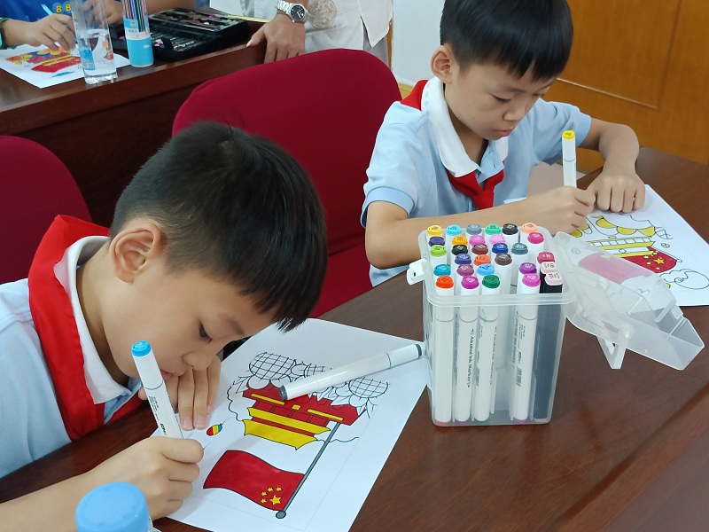 活动现场,一部以动漫方式展现的《四渡赤水出奇兵》红色故事把大家带到党史学习教育课堂上,通过清新简洁、精美流畅的画面再现历史细节,生动地讲述毛泽东同志在1935年1月至3月指挥红军四次渡过赤水河,把“围剿”的国民党军远远甩在身后的故事,感人的事迹,伟大的精神纷纷感染着现场所有人。“小朋友们,你们知道这面旗帜上面画着的锤子和镰刀代表什么吗?”一场你问我答的党史知识有奖问答把活动推向了高潮,大家纷纷举手踊跃参与,现场一片热烈的气氛。最后,大家拿起手中的水彩笔,给国旗、天安门、火箭等图案涂色,用涂鸦的方式表达爱党爱国情怀。