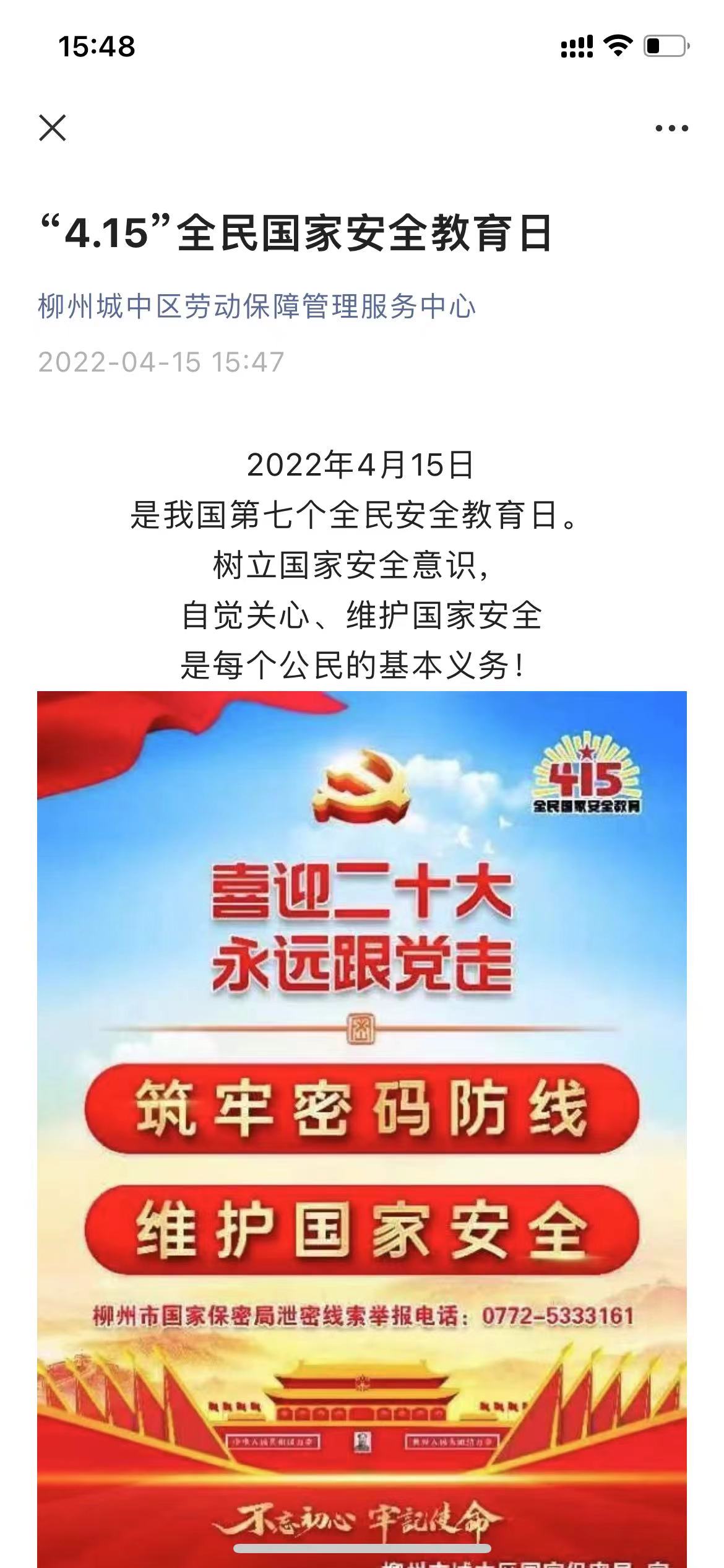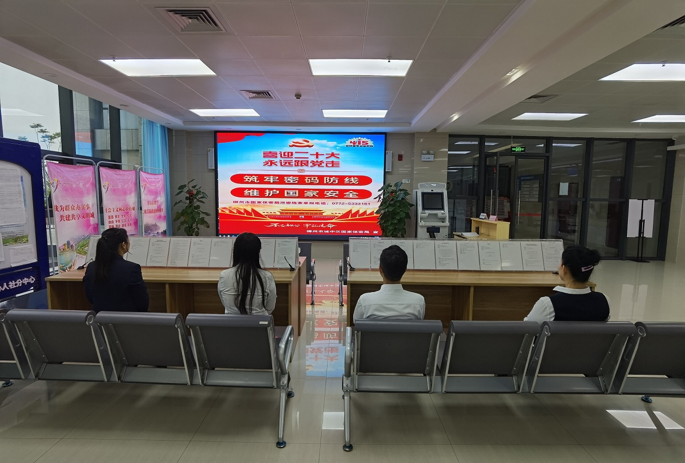 4月15日是我国第七个全民国家安全教育日,我局高度重视做好国家安全宣传教育工作,坚持以总体国家安全观为指导,多形式开展宣传教育活动。4月11日以来,先后利用城中区人社综合服务大厅等办公服务场所LED电子显示屏滚动播放宣传海报和短视频,利用微信公众号、宣传栏等载体不间断发布宣传资料和解读内容,各业务股室在显眼位置张贴“415全民国家安全教育”宣传logo,确保宣传的影响力和覆盖面,积极营造全员共筑安全屏障的浓厚氛围。