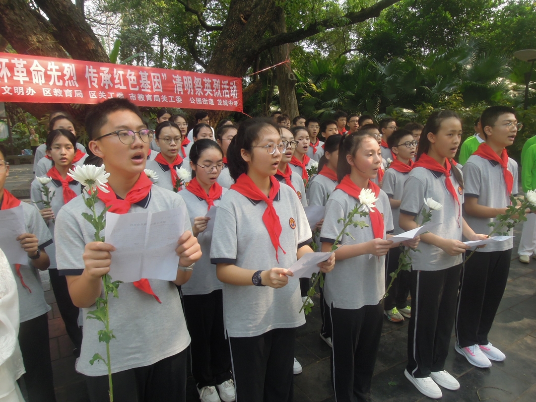 龙城中学50多名学生深情朗诵龙城中学校友贺智华烈士参加革命斗争写给姐姐遗书,重温烈士誓言:宁愿牺牲生命,不愿牺牲真理。同学们唱起“少年先锋队队歌”,表达青少年爱祖国、爱人民、热爱中华民族的信念,树立远大理想,立志为实现中国梦而努力奋斗。