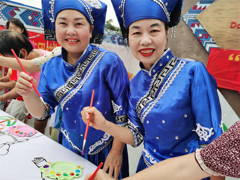 在铸牢中华民族共同体意识十米画卷的活动现场,居民手拿画笔、颜料,在画布上认真作画,一笔一笔勾勒出民族团结一家亲的美丽画卷。另一边,五色糯米饭、辣椒酿、马蹄糕、豆粉馍等民族特色小吃,吸引了大批市民驻足品尝。