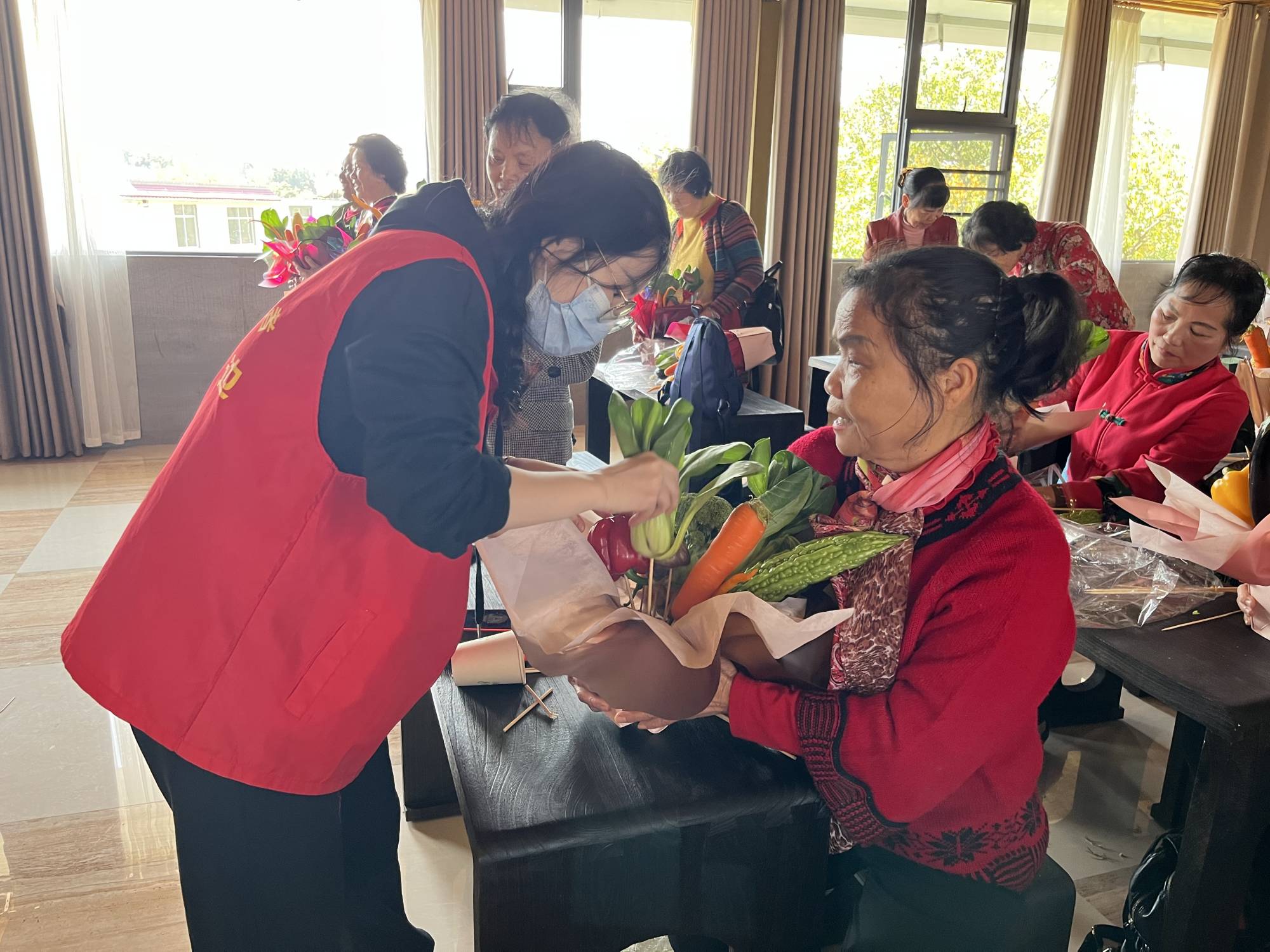 第三站来到了城中区文弘书院,在书院四楼,阿姨们在志愿者的帮助下进行蔬菜插花,将玉米、茄子、彩椒等蔬菜按自己的想法插进花篮中。不多时,阿姨们陆续完成了插花,她们高兴地拿起花篮拍照,向同伴炫耀起自己的作品。做完蔬菜插花后,潭东社区妇联工作人员和阿姨们一起切蛋糕,分享节日的甜蜜。