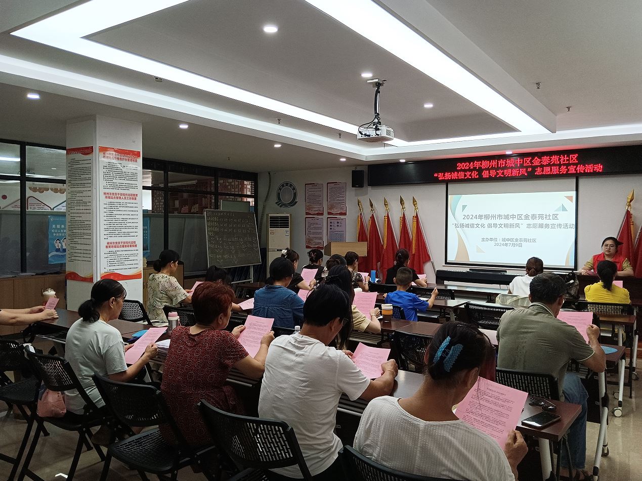 (城中区沿江街道讯 通讯员韦小娴报道)“言必诚信,行必忠正”,诚信是中华民族的传统美德。为进一步培育和践行社会主义核心价值观,全面推进诚信体系建设,弘扬诚实守信文明新风,形成全民自觉遵纪守法、诚实守信的社会风尚。近日,金泰苑社区积极开展“弘扬诚信文化 倡导文明新风”志愿服务宣传活动。