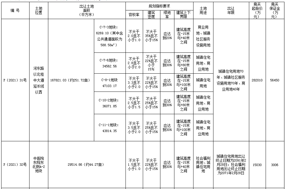 3、河东路以北桂中大道延长线以西地块:占地约251.72亩,由5宗地块组成。其中,C-7-3地块为商业用地、城镇社区服务设施用地;C-8-1地块为纯居住用地。C-7-6地块、C-10-2地块、C-11-1地块为商业、住宅用地。