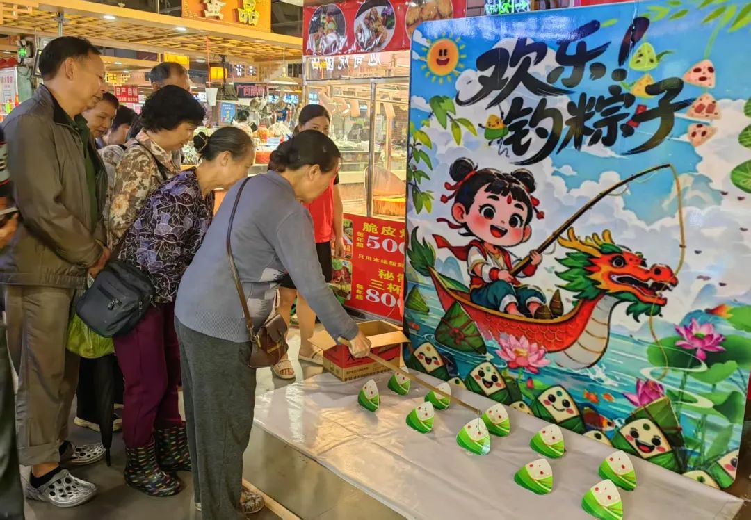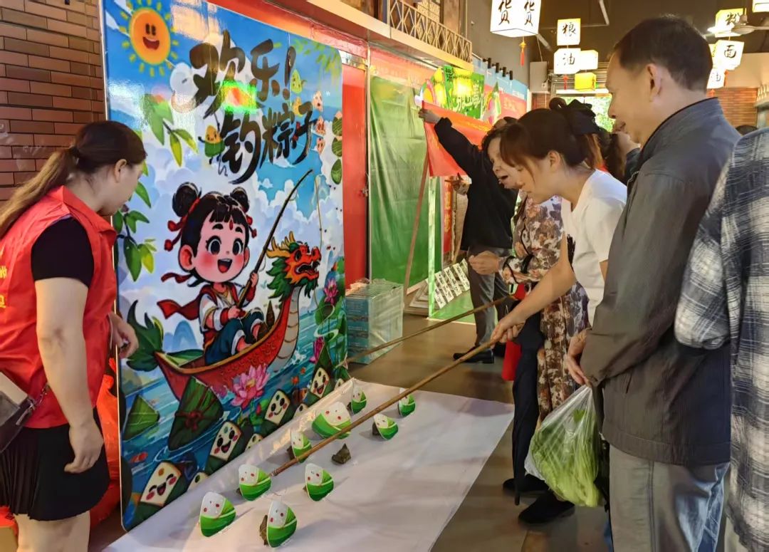 互动游戏区更是笑声不断、欢乐四溢。“射五毒驱邪纳吉”游戏前,居民们手持沙包,全神贯注地瞄准五毒靶盘,投中 2 个以上的幸运儿满心欢喜地兑换到新鲜艾草束;“钓粽子趣味赛”中,参与者紧握钓竿,争分夺秒地钓取象征吉祥丰收的粽子,1 分钟内钓到的粽子可直接带走,大家在紧张有趣的氛围里体会收获的喜悦;“好运投壶”游戏别具特色,缠绕着艾草的箭身投中壶中时,清香四溢,寓意吉祥,居民们跃跃欲试,投中者开心地领取小奖品;“巧手编五彩绳”活动吸引了众多老年朋友和居民,“银龄先锋”志愿服务队的老年人现场教学,大家精心挑选彩绳,认真编织,完成的五彩绳作品不仅寓意祈福平安,更成为一份独特的节日纪念。这些游戏不仅增添了节日的欢乐气氛,更在潜移默化中传播了清廉社区建设的理念。