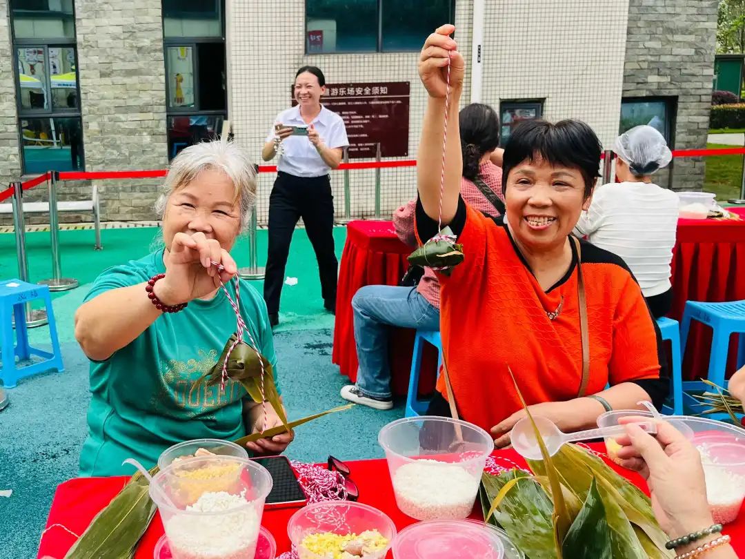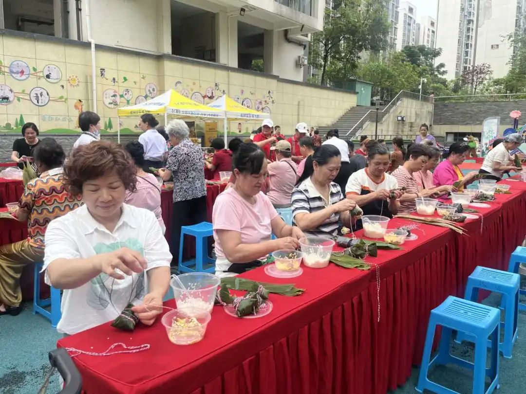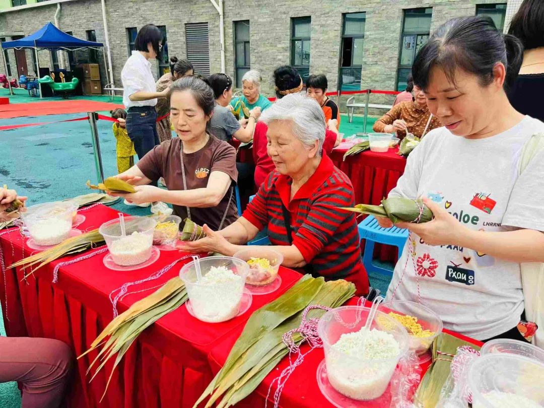 除了精彩的文艺演出,社区还为居民们准备了包粽子的材料,邀请大家一起动手包粽子。大家围坐在一起,互相交流包粽子的技巧,纷纷拿出自己的看家本领,捋粽叶、填糯米、放馅料、扎粽绳,动作娴熟,一气呵成。不一会儿,一个个饱满紧实、形状各异的粽子便摆满了桌面。大家一边包粽子,一边分享着各自家乡的端午节习俗和美食,在交流互动中,进一步加深了对不同民族文化的了解和认识。