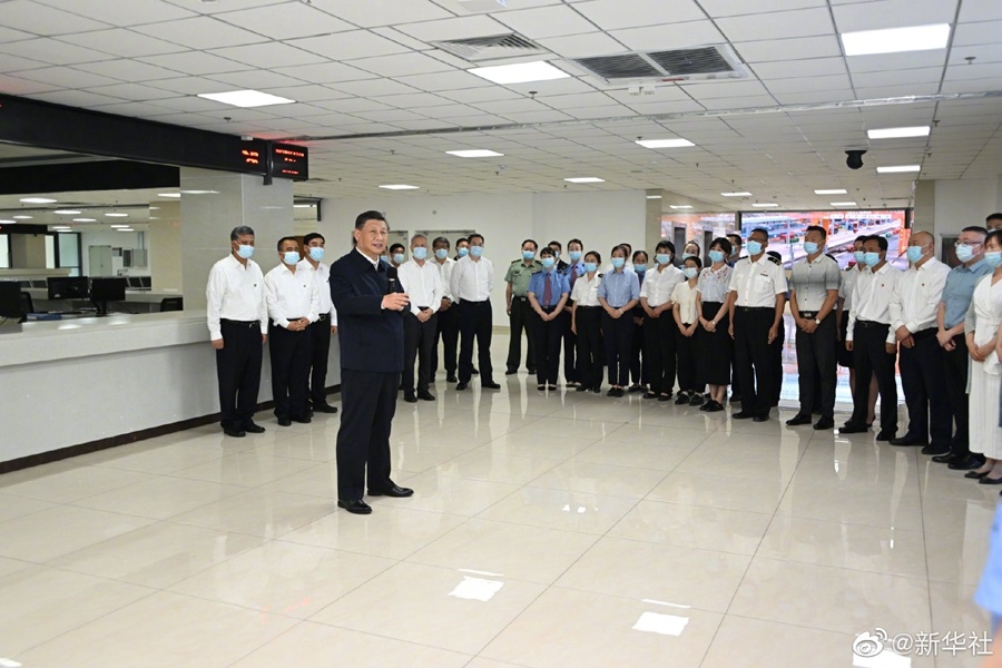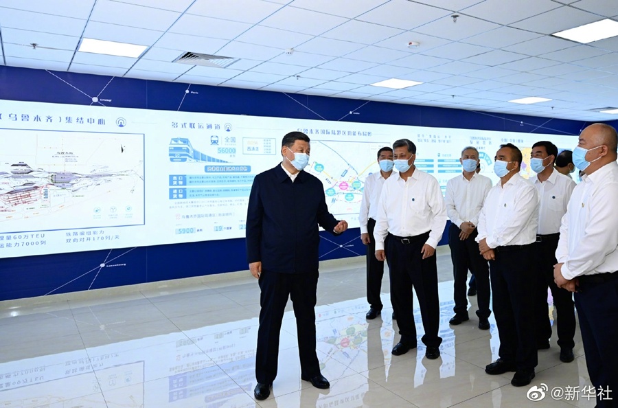 习近平总书记12日下午来到乌鲁木齐国际陆港区,听取整体情况介绍,通过实时画面察看中欧班列(乌鲁木齐)集结中心各功能区和阿拉山口口岸、霍尔果斯口岸现场作业情况,并同工作人员及现场办事人员亲切交流。习近平说,共建“一带一路”倡议提出这些年来,硕果累累。随着共建“一带一路”深入推进,新疆不再是边远地带,而是一个核心区、一个枢纽地带,你们做的是具有历史意义的事情,已经取得很好的成绩,再接再厉,前途光明。(文字记者张晓松 朱基钗 摄影记者李学仁 谢环驰)