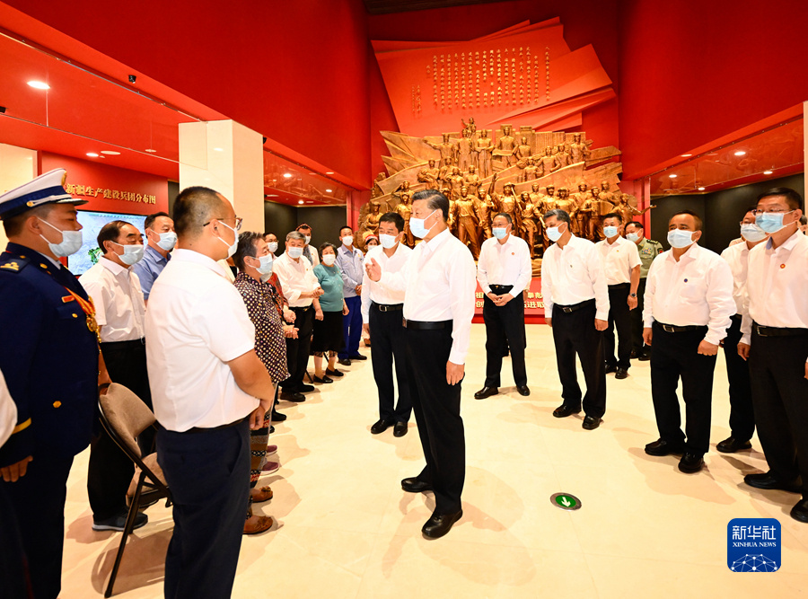 7月12日至15日,中共中央总书记、国家主席、中央军委主席习近平在新疆考察。这是13日下午,习近平在新疆生产建设兵团八师石河子市新疆兵团军垦博物馆,会见兵团老中青三代建设者代表。新华社记者 李学仁 摄
