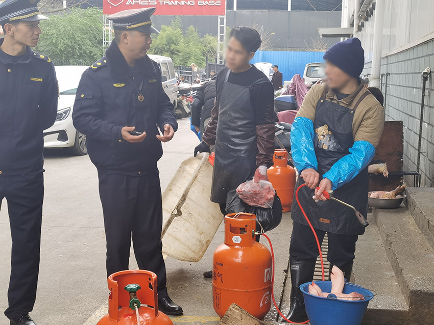 此外,执法人员还组织人员“送货上门”,深入市场内向摊主、商家开展宣传,为商家排查了各种燃气使用中常见故障及隐患。行动中,执法人员在市场的“肉类区”发现4瓶摊主用来处理猪脚的燃气瓶没有安装减压阀,使用的是软胶管等情况,存在安全隐患。