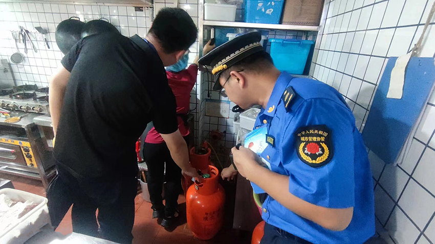 (城中区执法局讯 通讯员邓湖广报道)夏季天气炎热,在高温环境下,燃气软管更易发生老化,液化气的角阀、减压阀等设施也容易产生意外漏气问题。为进一步做好高温期间燃气安全工作,连日来,城中区综合行政执法局在辖区持续开展燃气检查行动,对辖区内的餐饮店铺用气安全进行全面排查。