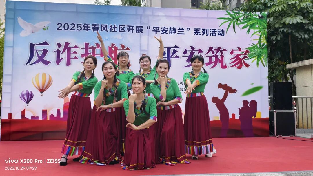老人们在享用茶点的同时“平安静兰 平安筑家” 反诈文艺演出准时开场。此次演出由春风社区精心策划,邀请社区银龄文艺队倾情出演。物业还特意协调安保团队维持现场秩序,为老人们营造安全舒适的观看环境。