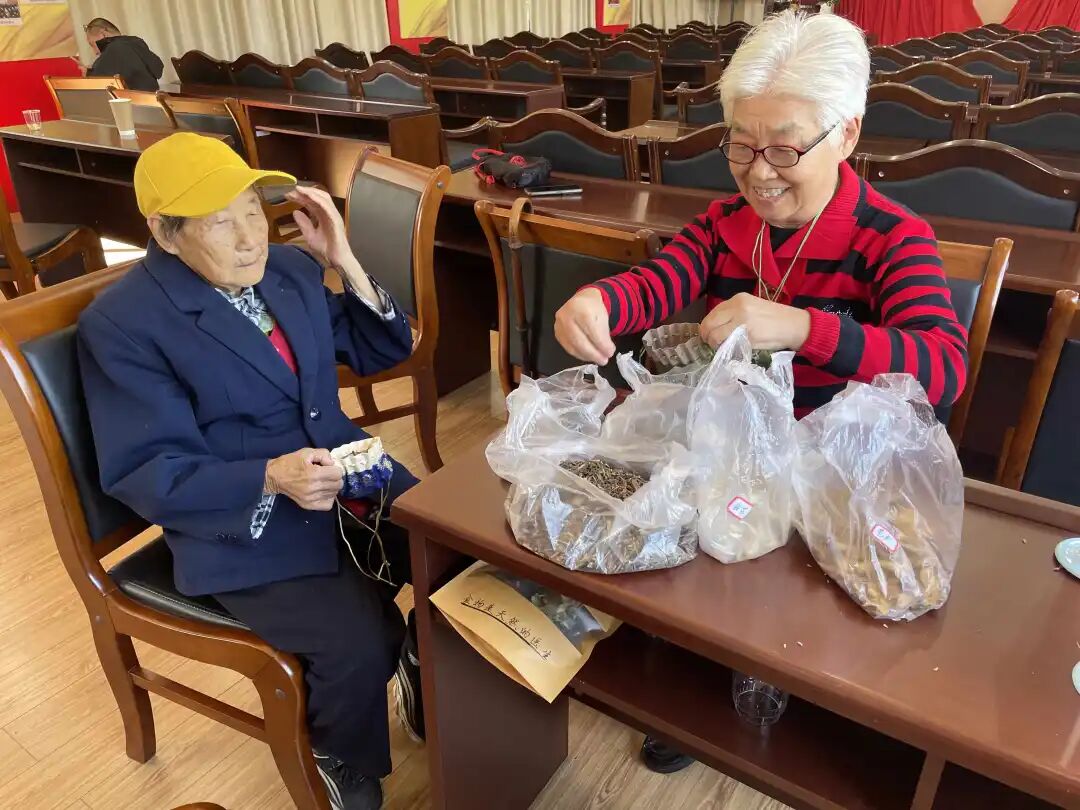 随后老师现场示范并讲解了不同香料的功效与搭配原则,老人们将提前备好的艾叶、丁香、陈皮等各式香料,细心装入一个个精致的香囊袋中,不一会儿,药香清雅的香囊便在老人手中诞生。活动现场还准备了润肺养生茶、银耳百合汤和重阳糕点供大家品尝。老人们品着茶点,交流心得,现场其乐融融,充满了节日的温馨。