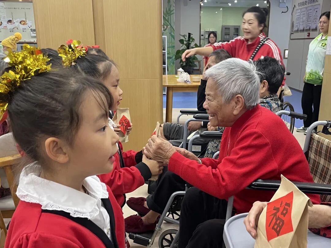 最动人的是“送礼物表孝心”环节。孩子们手捧满载爱意的小礼物,将小礼物郑重地送给爷爷奶奶,并送上甜甜的祝福。这份突如其来的惊喜,让老人们笑容绽放,他们亲切地拉着孩子们的手,场面温馨感人。