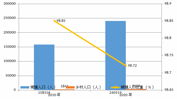 全区人口中,居住在城镇的人口为240519人,占98.72%;居住在乡村的人口为3109人,占1.28%。与2010年第六次全国人口普查相比,城镇人口增加82143人,乡村人口增加1268人,城镇人口比重降低0.13个百分点。