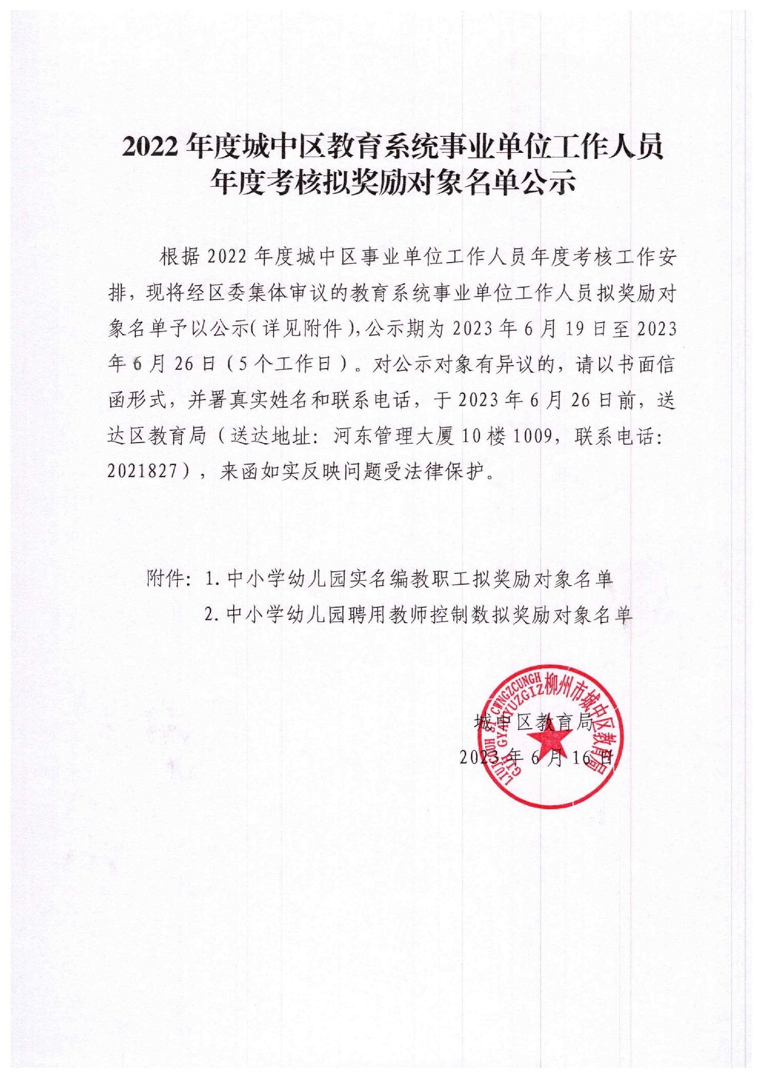 2022年度城中区教育局系统事业单位工作人员年度考核拟奖励对象名单公示