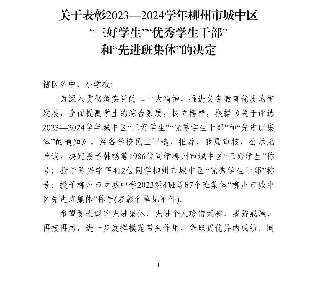 城中教字〔2024〕10号关于表彰2023—2024学年柳州市城中区“三好学生”“优秀学生干部”和“先进班集体”的决定