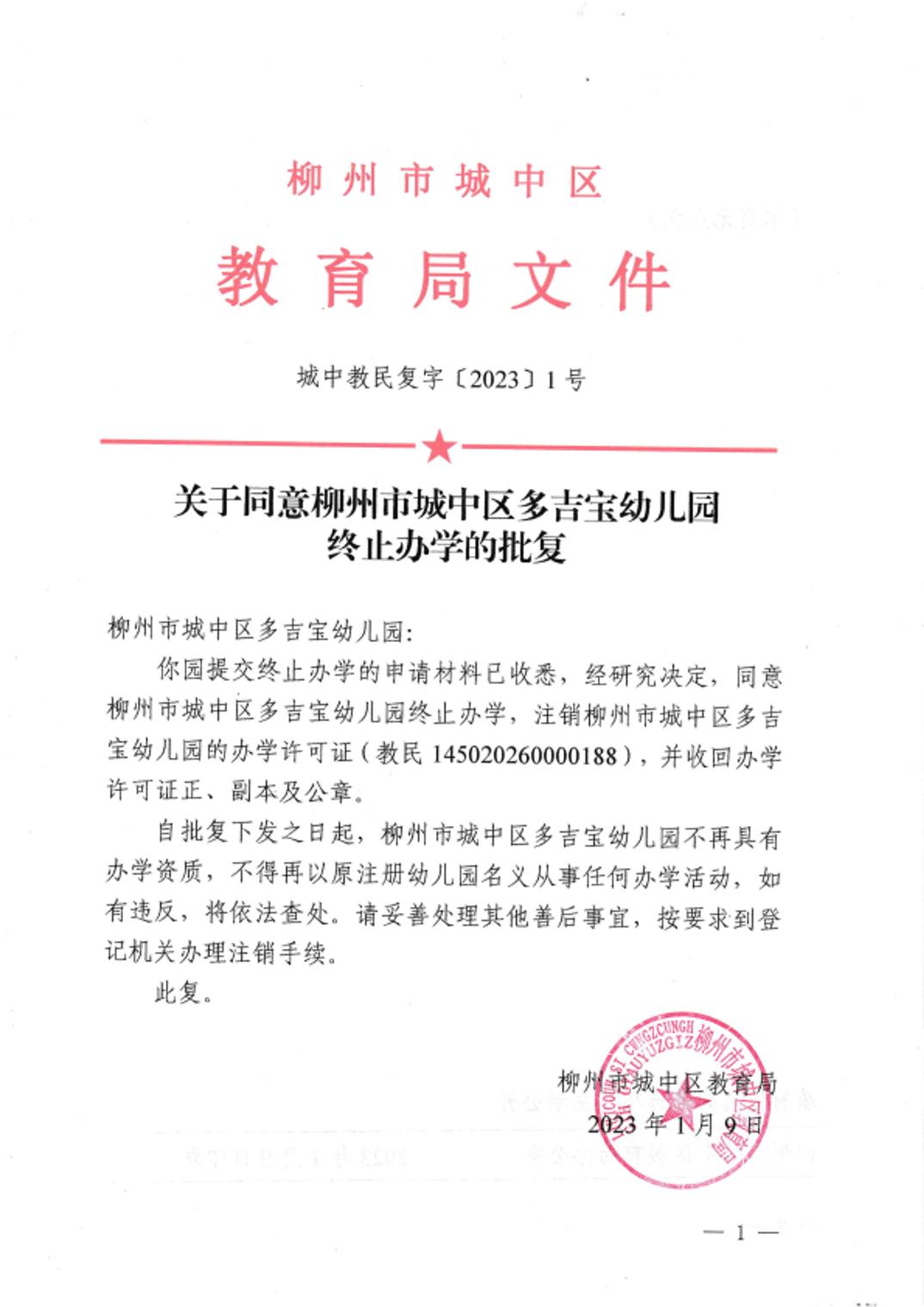 城中教民复字〔2023〕1号关于同意柳州市城中区多吉宝幼儿园终止办学的批复