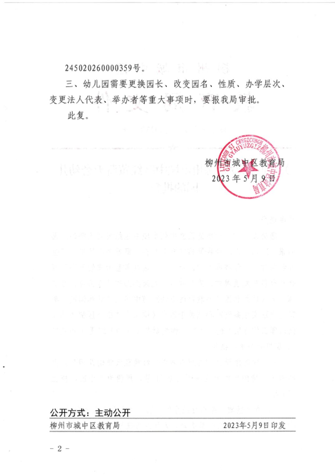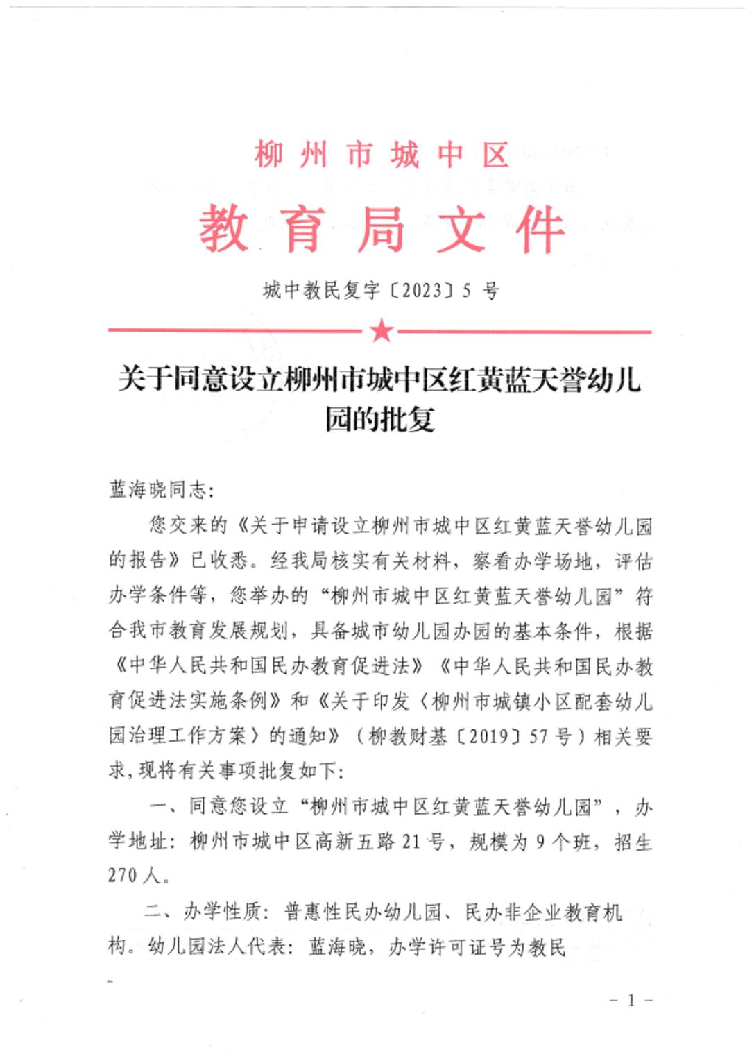 城中教民复字〔2023〕5号关于同意设立柳州市城中区红黄蓝天誉幼儿园的批复