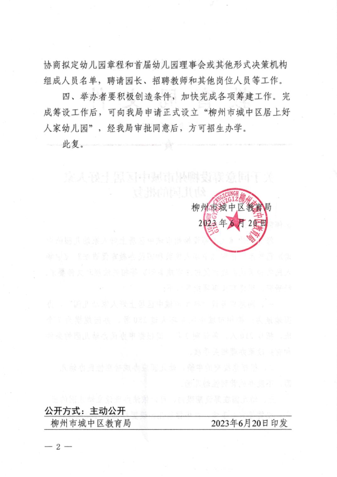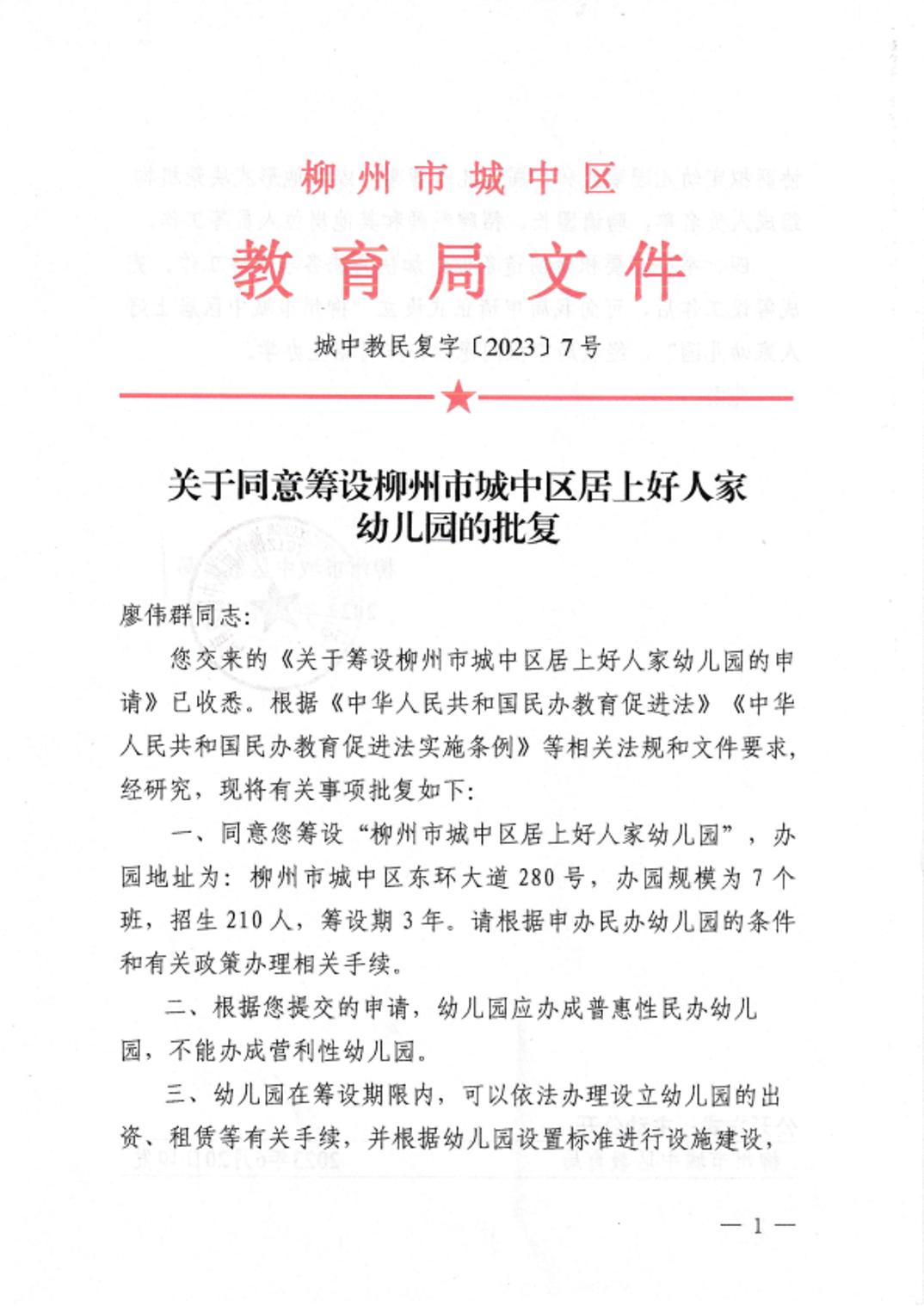 城中教民复字〔2023〕7号关于同意筹设柳州市城中区居上好人家幼儿园的批复