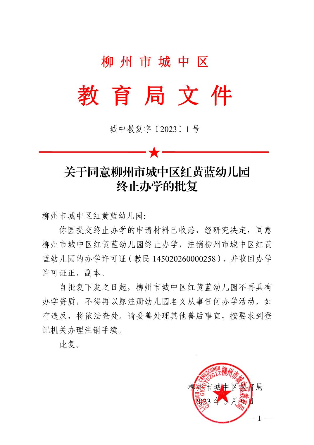 城中教复字〔2023〕1号关于同意柳州市城中区红黄蓝幼儿园终止办学的批复