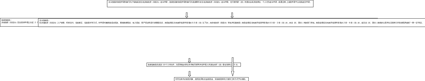 1.因火灾、交通事故等意外事件或其他不可抗因素造成  重大人身伤害,或家庭财产(主要指家庭唯一住房或作为主要经济来源的经营性场地与设施)被损毁导致无法继续居住、经营,事故责任赔付不能及时到位或者无责任赔付方,造成家庭丧失主要经济来源导致基本生活难以维持需要立即采取救助措施的;