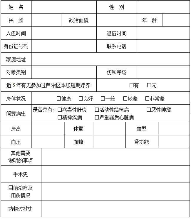 备注:生活不能自理者或有新冠肺炎、病毒性肝炎、活动性肺结核、恶性肿瘤、精神病、严重器质心脏病等传染病和危急重病不列入疗养范围。