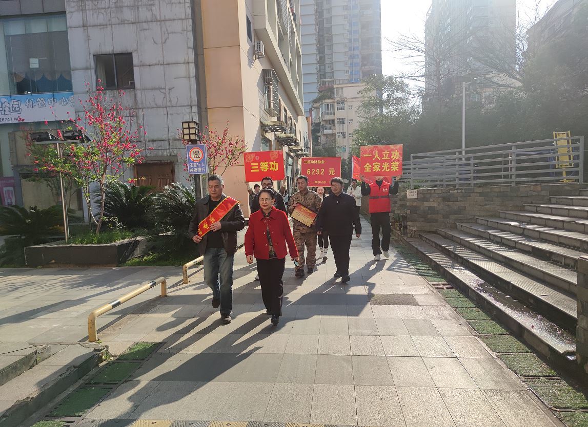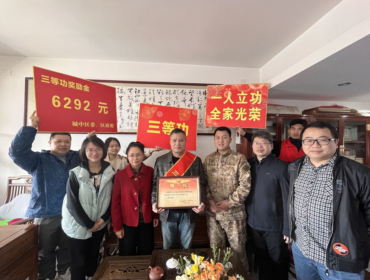 (城中区沿江街道讯 通讯员赵小媛报道)为进一步弘扬拥军优属的光荣传统,营造关爱功臣模范的社会氛围,3月19日上午,城中区退役军人事务局、区人民武装部、沿江街道党工委代表一行人,到金泰苑社区走访荣立三等功的现役军人家属,为他们送去立功喜报,并为他们披上绶带,送上党和政府的关怀。