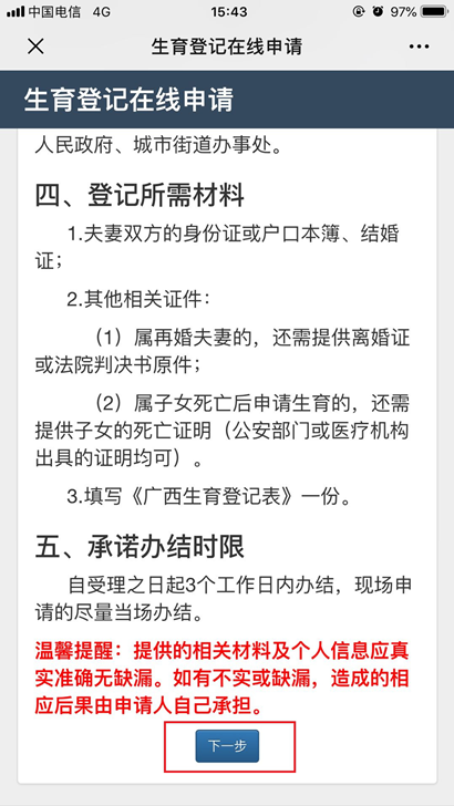 ⑤ 阅读登记所需材料,准备好相应的证件照片,点击下一步
