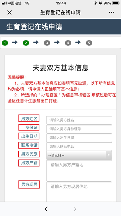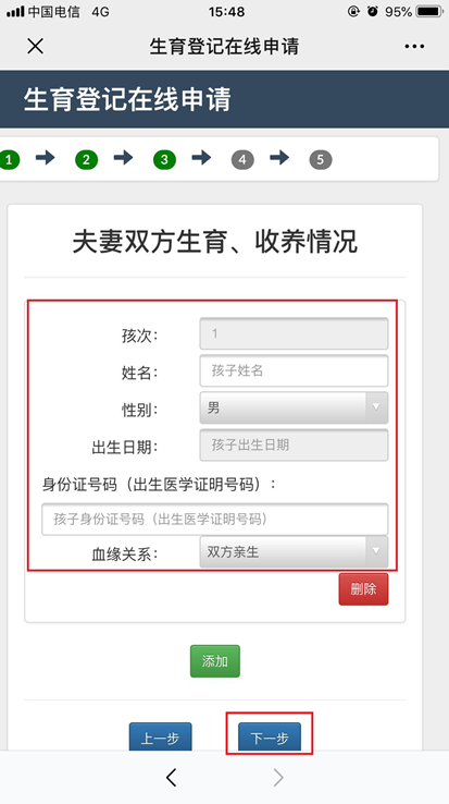 ⑦ 填写夫妻双方生育子女情况,非必填项,未生育子女的夫妻在操作时可以直接点击下一步