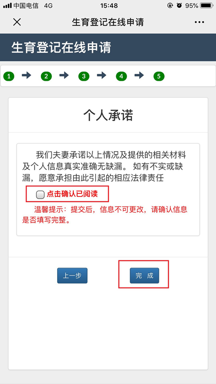 ⑨ 请核对填写信息和上传的证件照片无误后,勾选个人承诺,点击“完成”按钮,即完成网上申请流程。